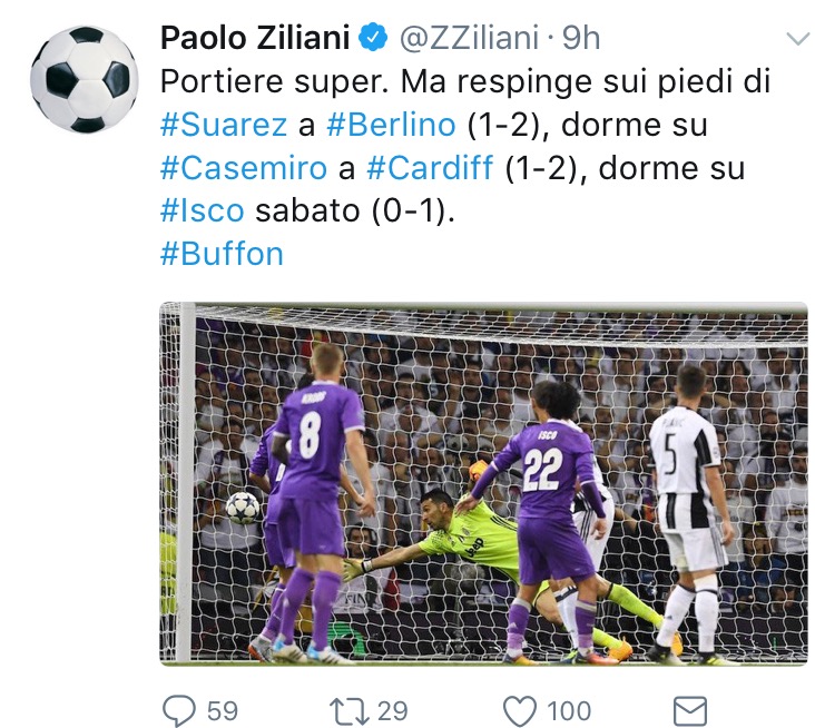Paolo Ziliani , giornalista sportivo del Fatto Quotidiano , si scatena su Twitter ironizzando sul valore del portiere italiano più forte della storia del calcio Gigi Buffon.