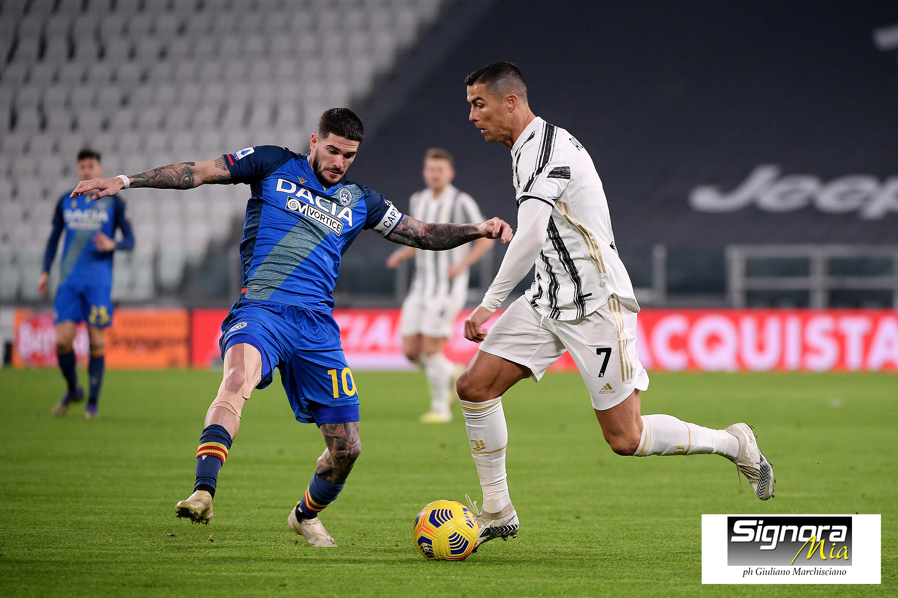 Palla iniziale ai friulani. Parte la gara. Prime fasi di gioco. Ci prova Cristiano Ronaldo. Palla fuori di poco. Occasione per Ramsey. Musso in angolo. Amnesia Juve e l’Udinese segna De Paul che mette la palla in rete, ma c’è un tocco di mano precedente. Il Var annulla per fortuna dei bianconeri. Si vede in campo la squadra molle che ha affrontato la Viola. Alex Sandro cerca il secondo palo, ma nessuno riceve la palla. Punizione dalla destra per la Juve. Dybala tira, ma Musso para. La Juve non ingrana. Possesso palla inattivo. Gol della Juve. Errore di De Paul. Ramsey serva CR7, che batte Musso. 1-0. Punizione dalla destra per la Juve. Riesce a liberare l’Udinese. Incursione di McKennie. Musso para. 2′ di recupero. Si chiude qui la prima frazione col vantaggio della Juve. Inizio traballante della Juve che lascia spazio agli ospiti che segnano con De Paul che mette la palla in rete per un tocco di mano precedente. Il Var annulla. Poi, la Juve si sveglia e va in vantaggio. Lo stesso De Paul perde palla nella sua trequarti. Ramsey ruba palla e serve Ronaldo che insacca. Palleggio sterile da migliorare.