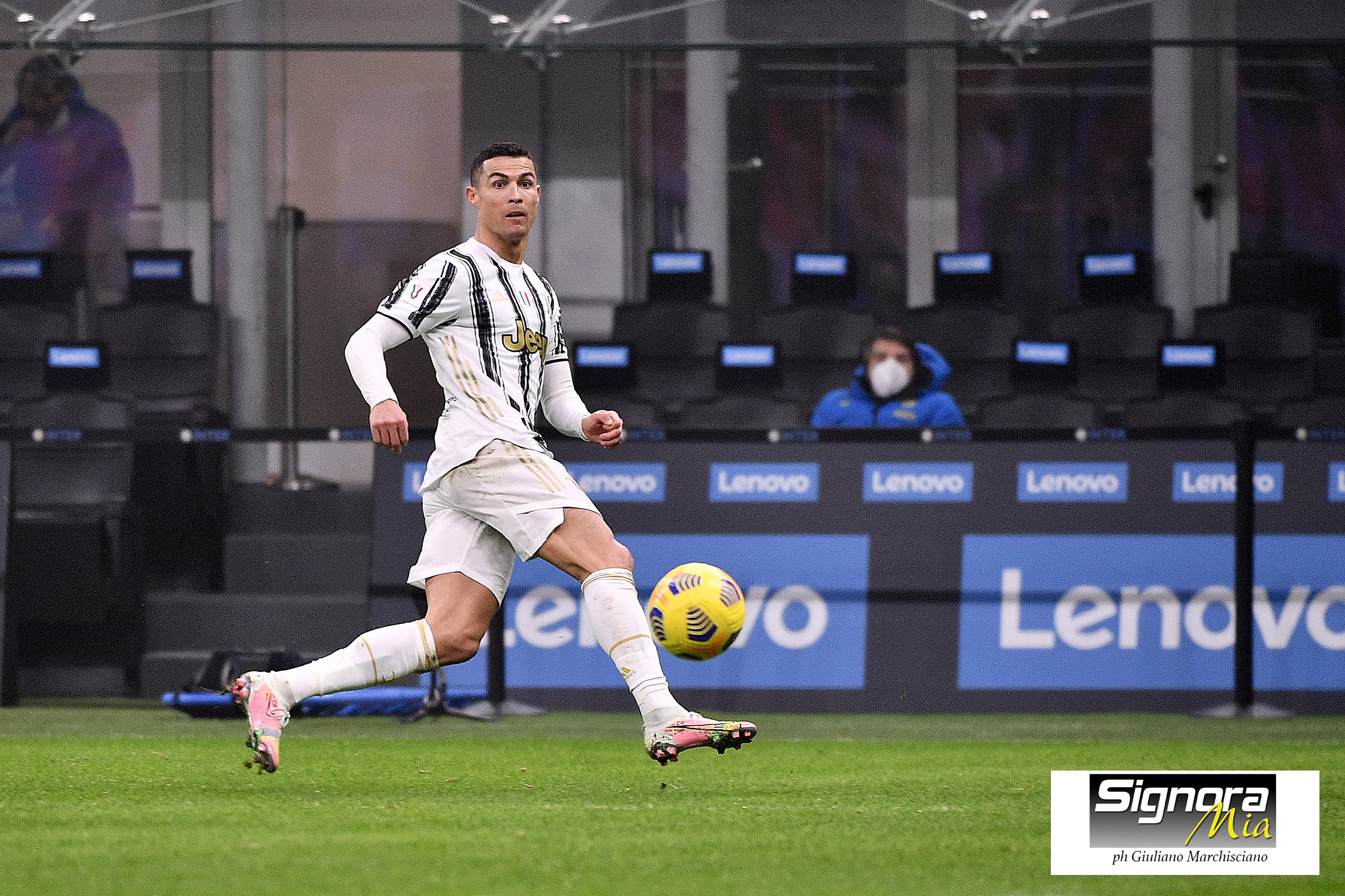 Palla iniziale alla Juve. Parte la semifinale d’andata del Derby d’Italia. Prime fasi di gioco. Inter in vantaggio. Barella come quindci giorni fa, supera Alex Sandro e mette in mezzo per Lautaro Martinez. Buffon non trattiene. 1-0. Ci prova Alex Sandro. Palla alta. Gioco Juve che non decolla per il controllo da parte dell’Inter. Azione da rigore per una trattenuta di Young a Cuadrado. Var. Penalty Juve. Cristiano Ronaldo, batte Handanovic. 1-1. Punizione Inter dalla destra. Palla messa sulla testa di Skriniar. Palla fuori. Juve in vantaggio. Bastoni sbaglia servendo CR7. Per lui un gioco da ragazzi segnare. 1-2. Gol pesante. Ci prova CR7. Palla alta. Si vede Bentancur. Tiro centrale. Para Handanovic. 1′ di recupero. Termina la prima frazione con il vantaggio Juve 1-2. Vantaggio Inter con Lautaro Martinez. Poi arriva il Cristiano Ronaldo show. Prima su rigore, poi bravo a recuperare palla ad un errore di Bastoni e mettere in rete.