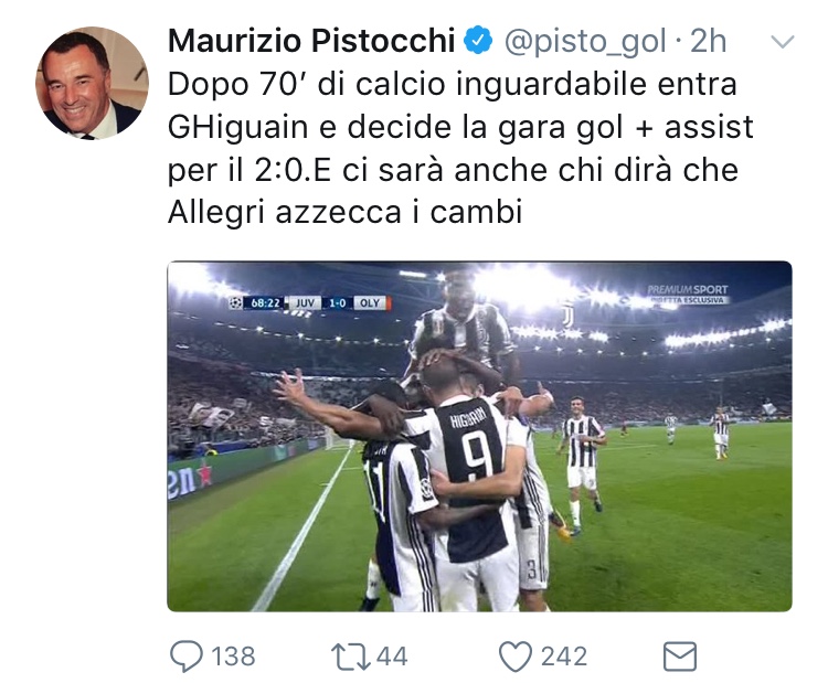 Neanche questa è andata giù a Maurizio Pistocchi. Il giornalista di premium sport commenta così su Twitter la vittoria in champions league della Juventus .